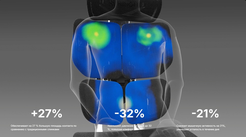 Особое внимание уделено инновационной конструкции спинки. Ее гибкость и адаптивность, достигаемая за счет четырех панелей, создают эффект "объятий", мягко поддерживая позвоночник и снимая с него нагрузку. Это не просто поддержка, а активное взаимодействие с вашим телом, которое способствует поддержанию естественных изгибов позвоночника и предотвращению усталости. Синхромеханизм наклона спинки и сиденья обеспечивает гармоничное движение, позволяя вам плавно переходить от рабочего положения к расслабленному, сохраняя при этом правильную осанку.
